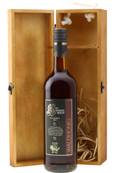 Ansprechende Holzbox für Metflasche der MET Amensis Honigwein Kellerei