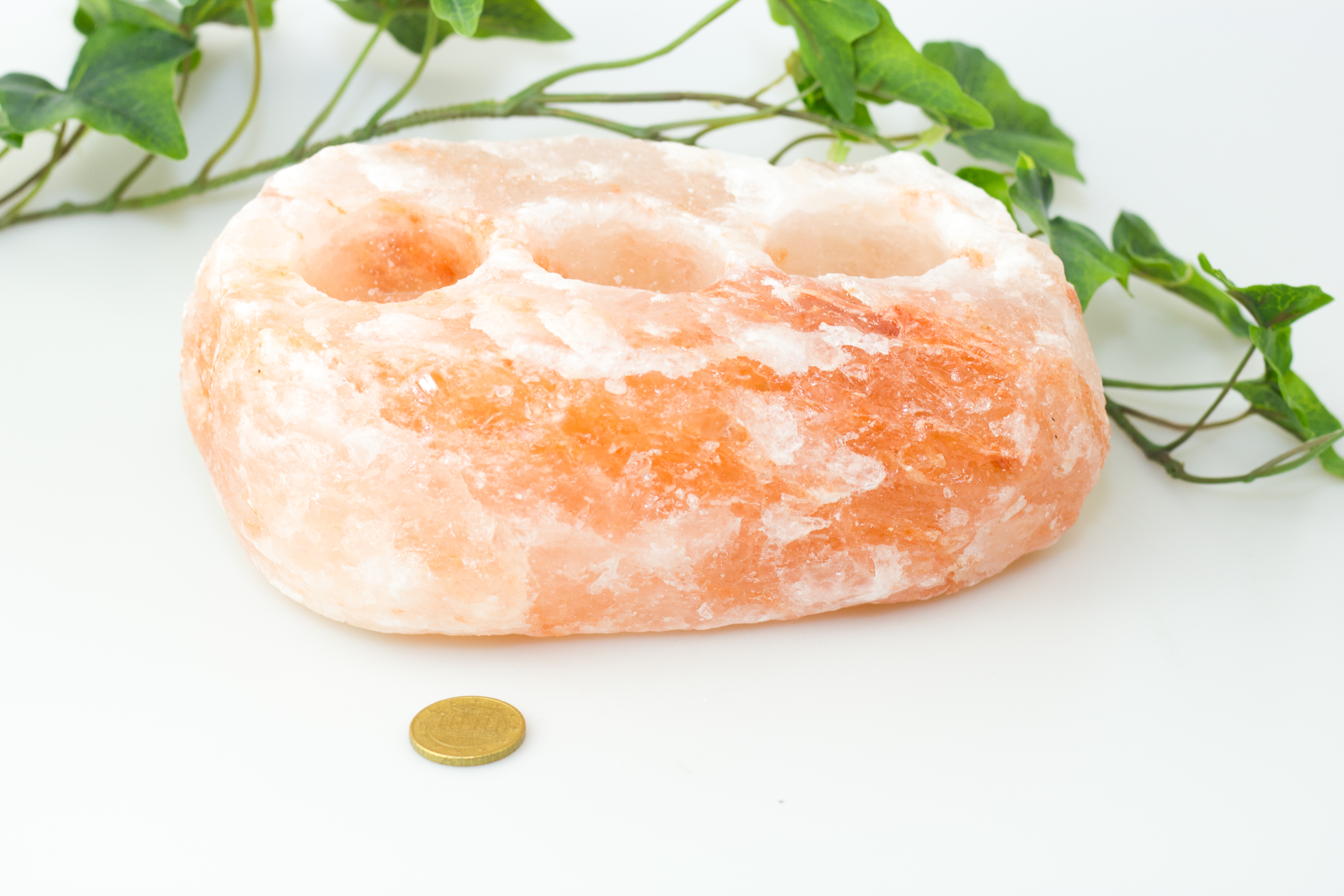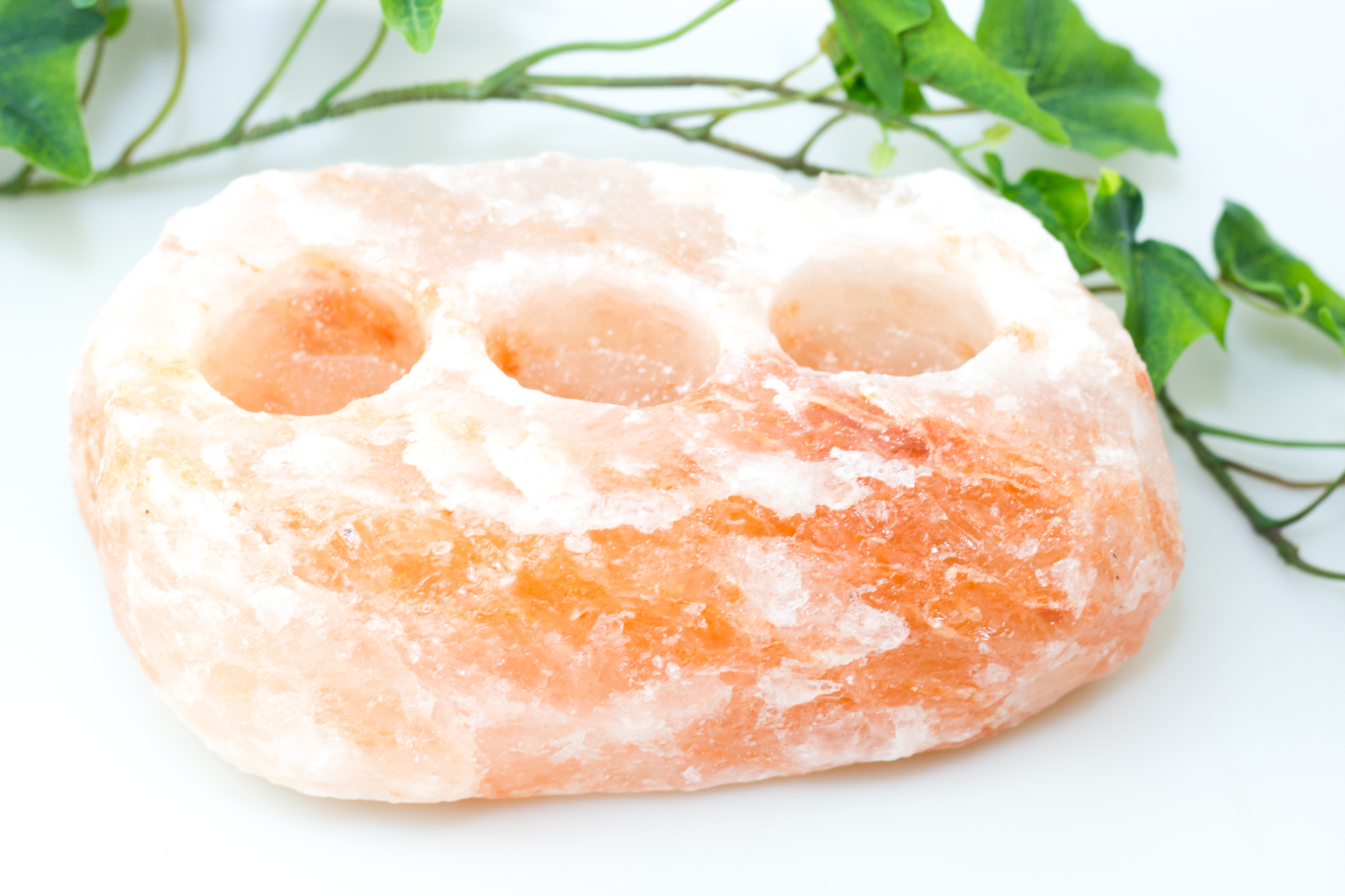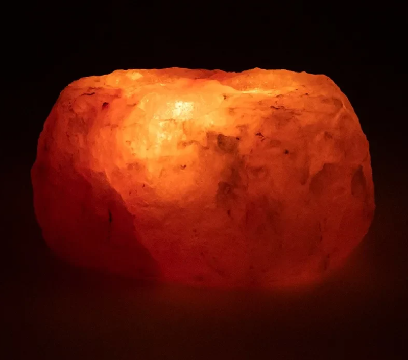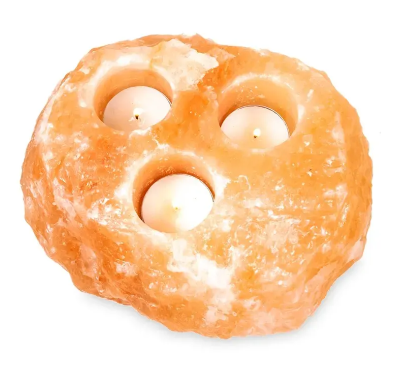 Stimmungsvolles Salzkristalllicht mit Platz für drei Teelichter. Für eine schöne Flamme und eine gesunde Atmosphäre in Wohn-, Arbeits- oder Schlafzimmer.